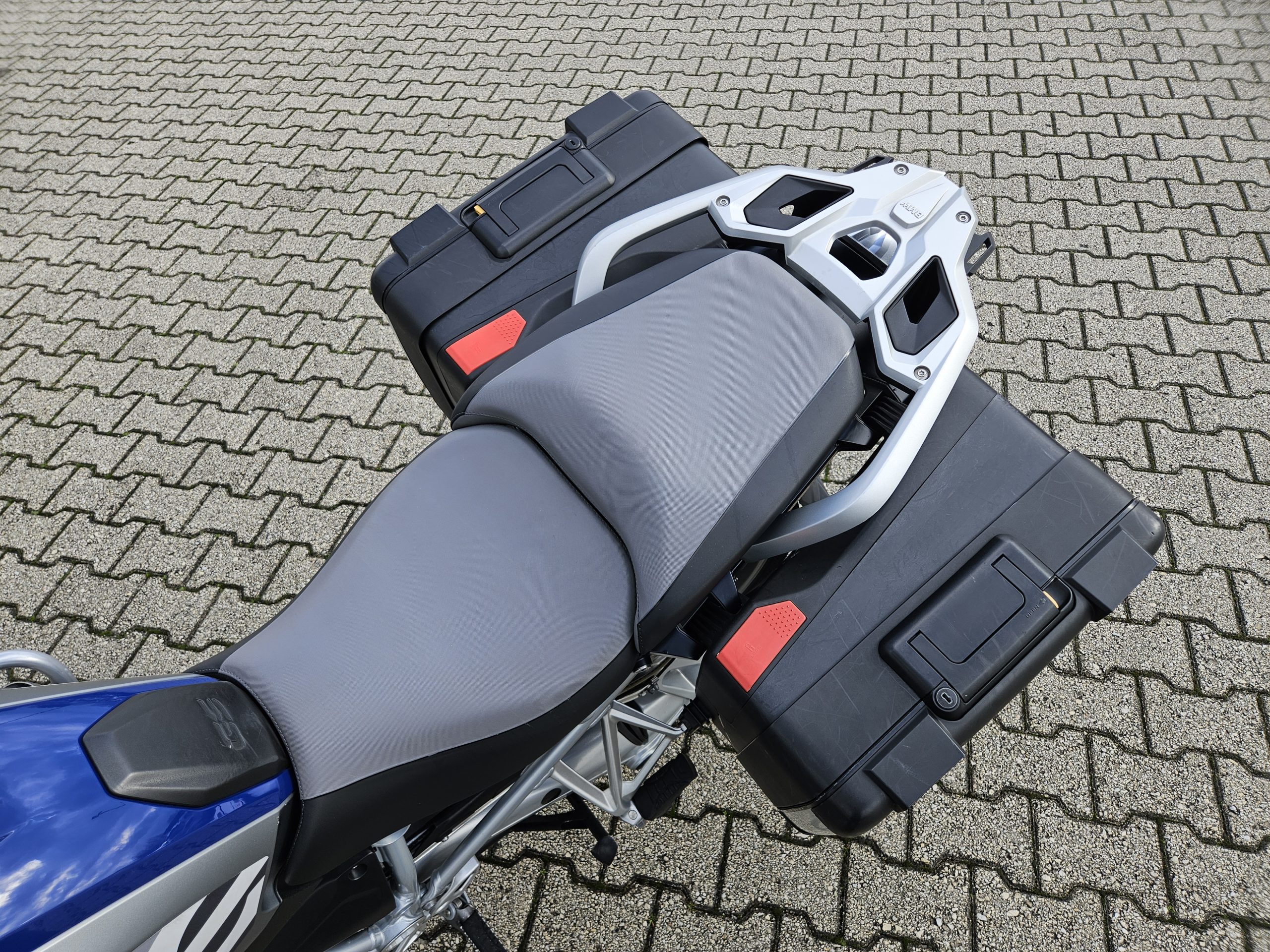 Cupolino maggiorato fumé, paramani, paramotori tubolari in alluminio completi, valigie laterali originali Vario BMW.