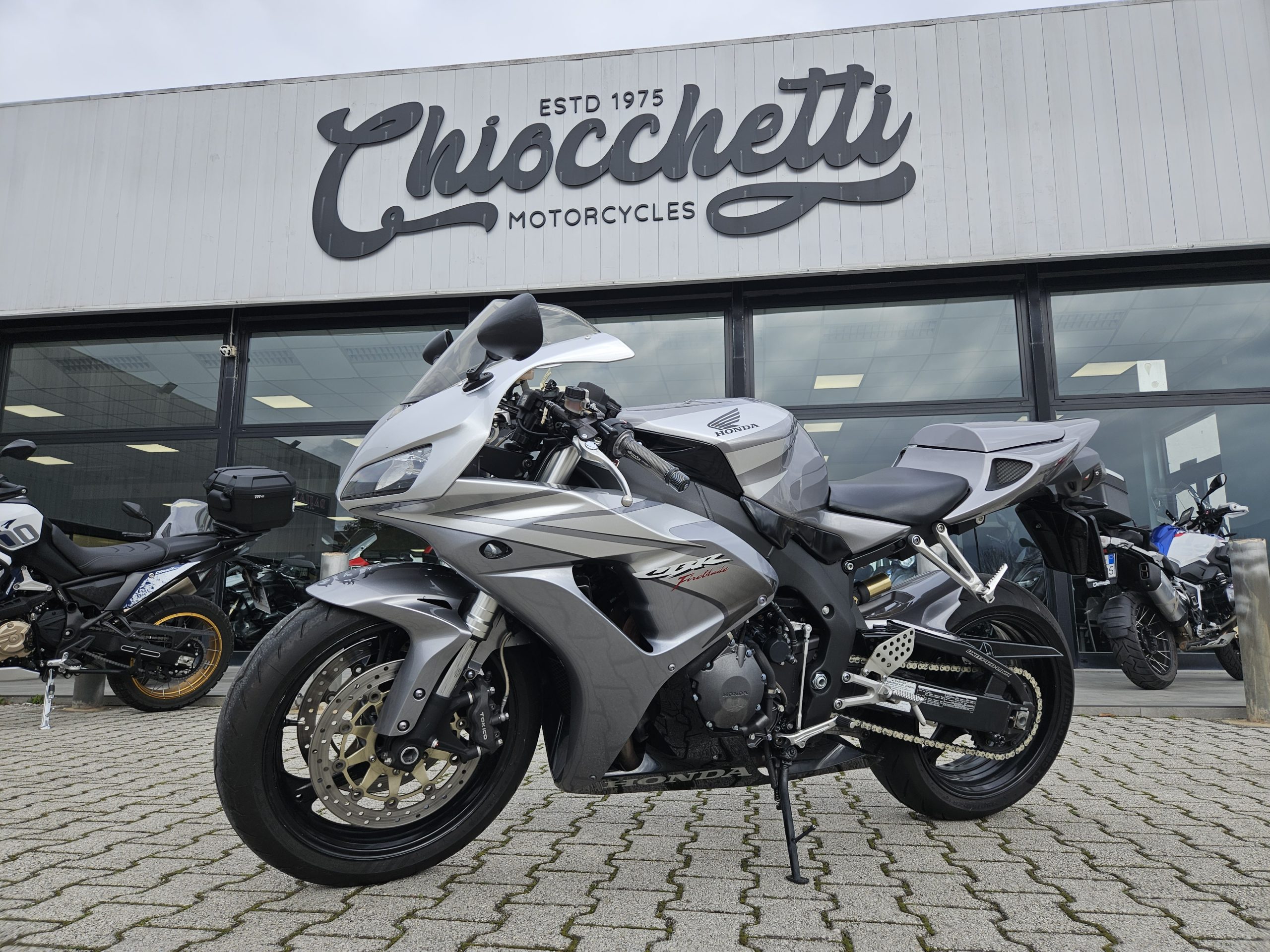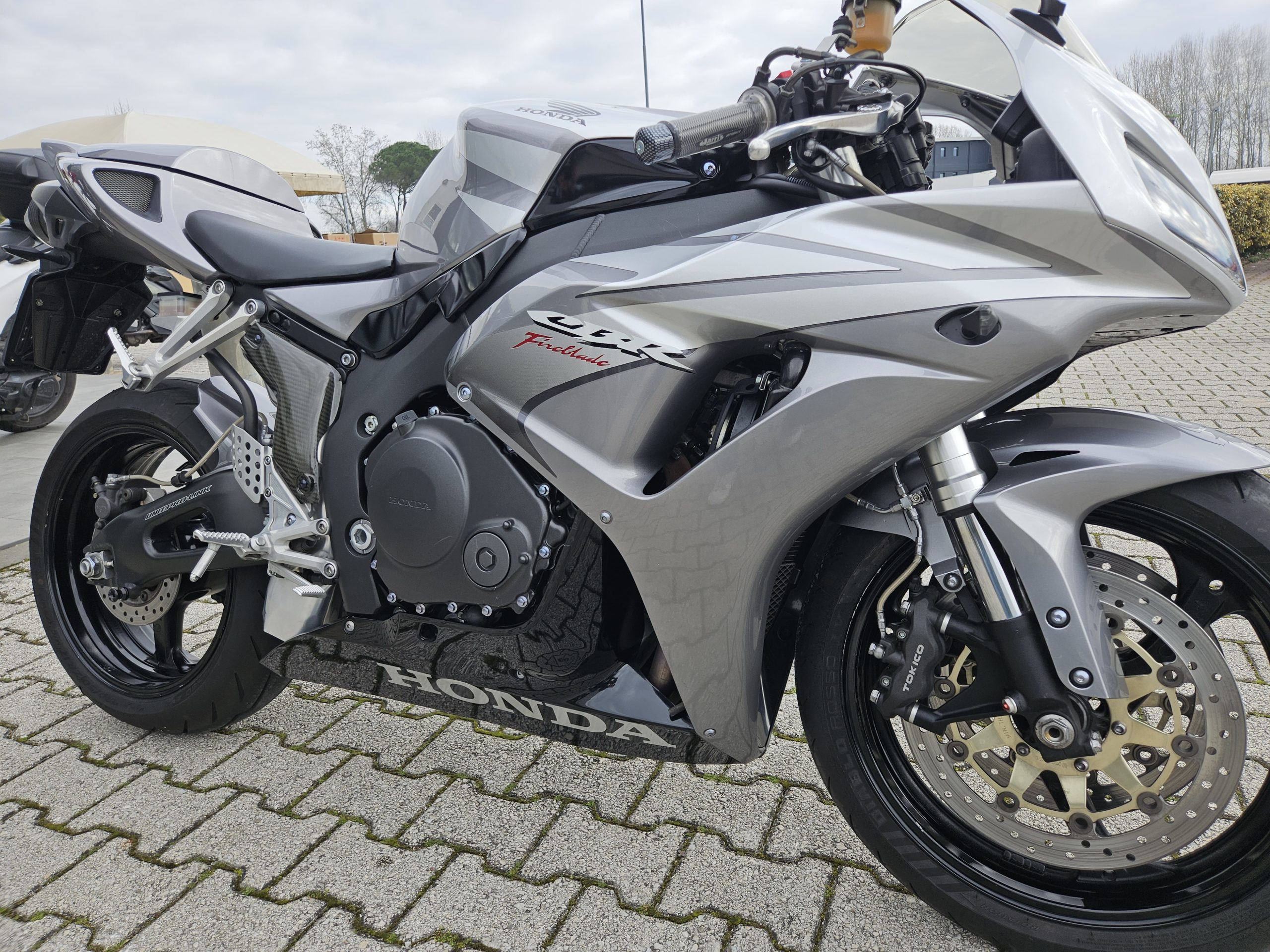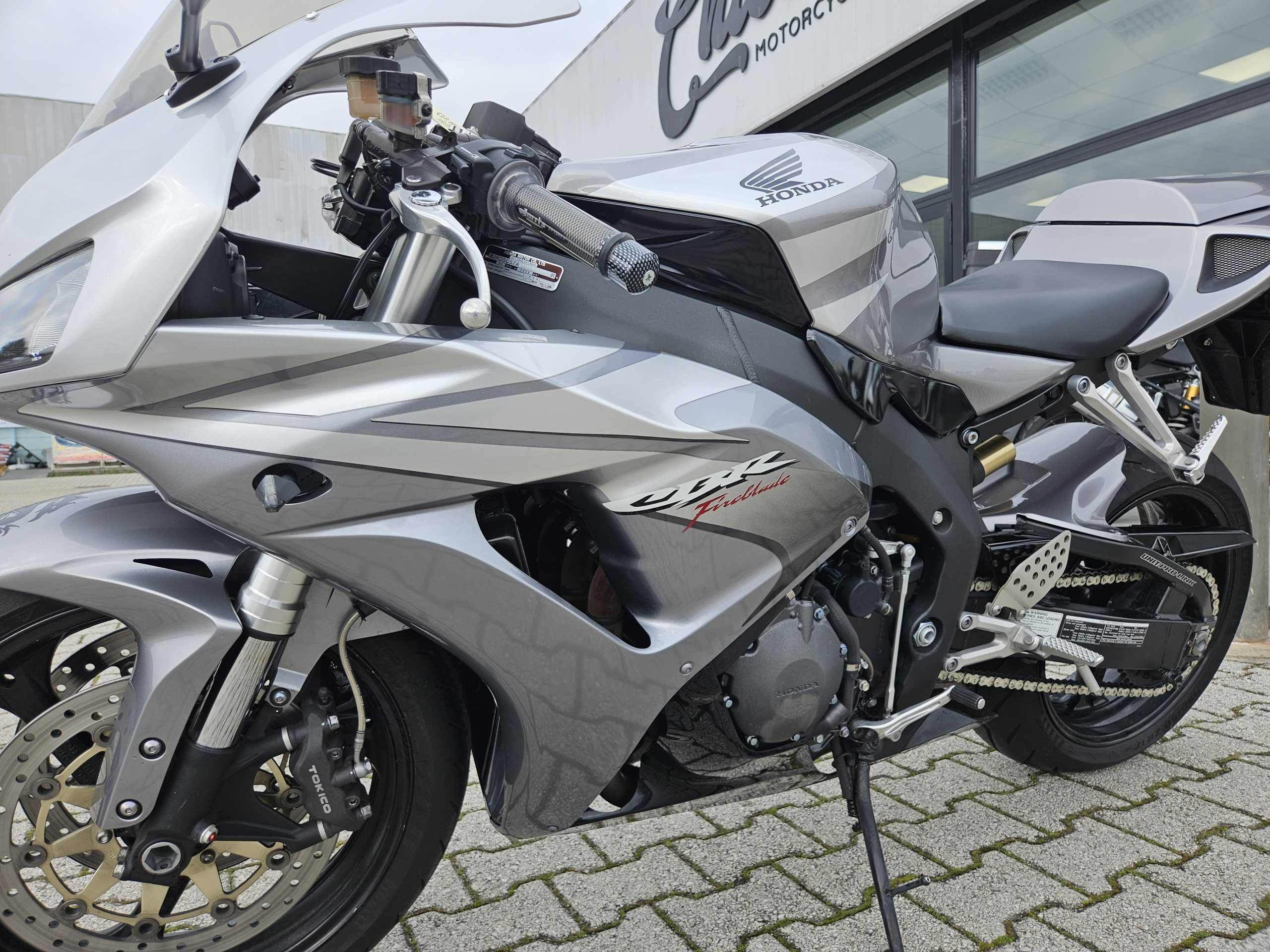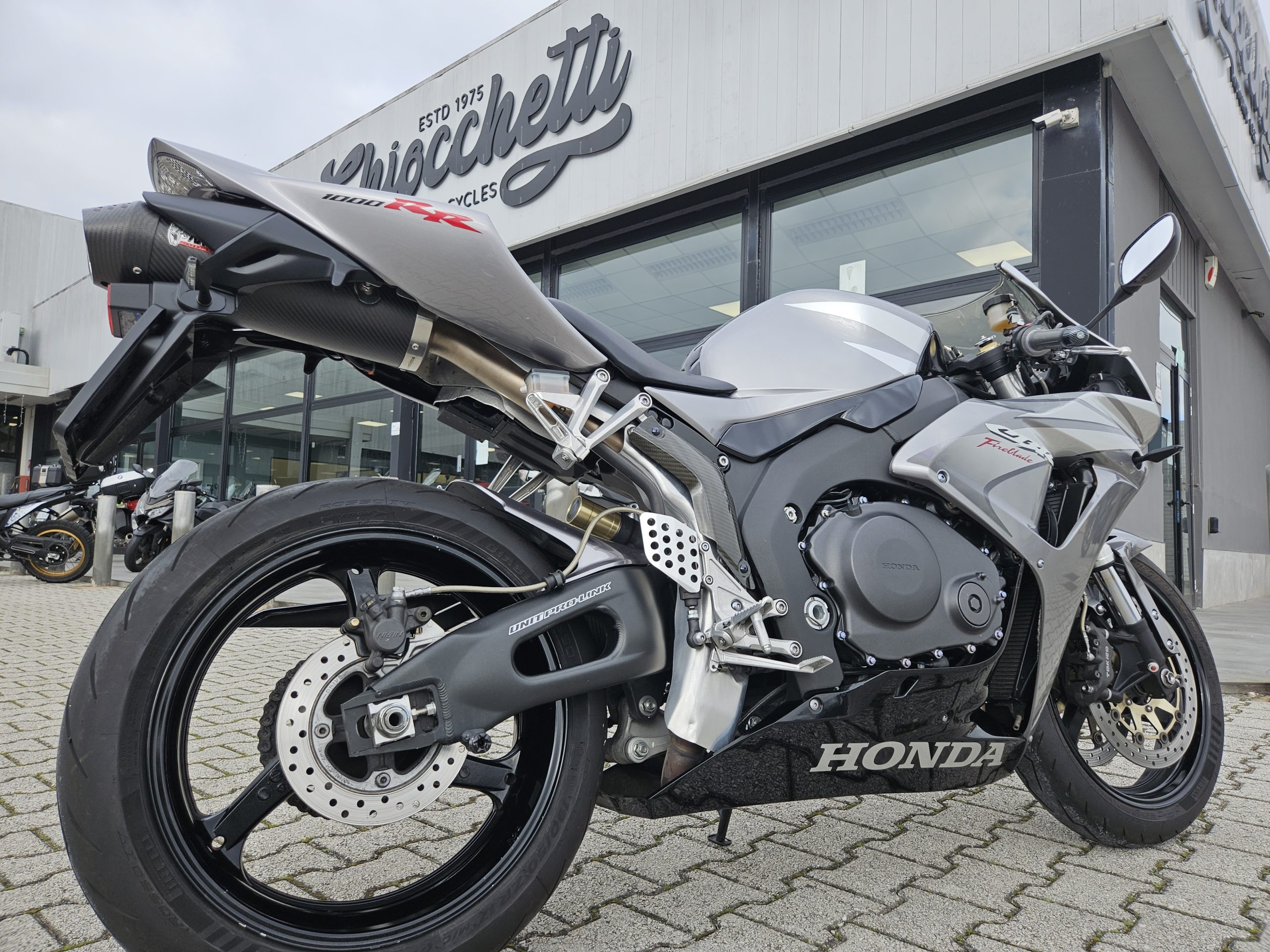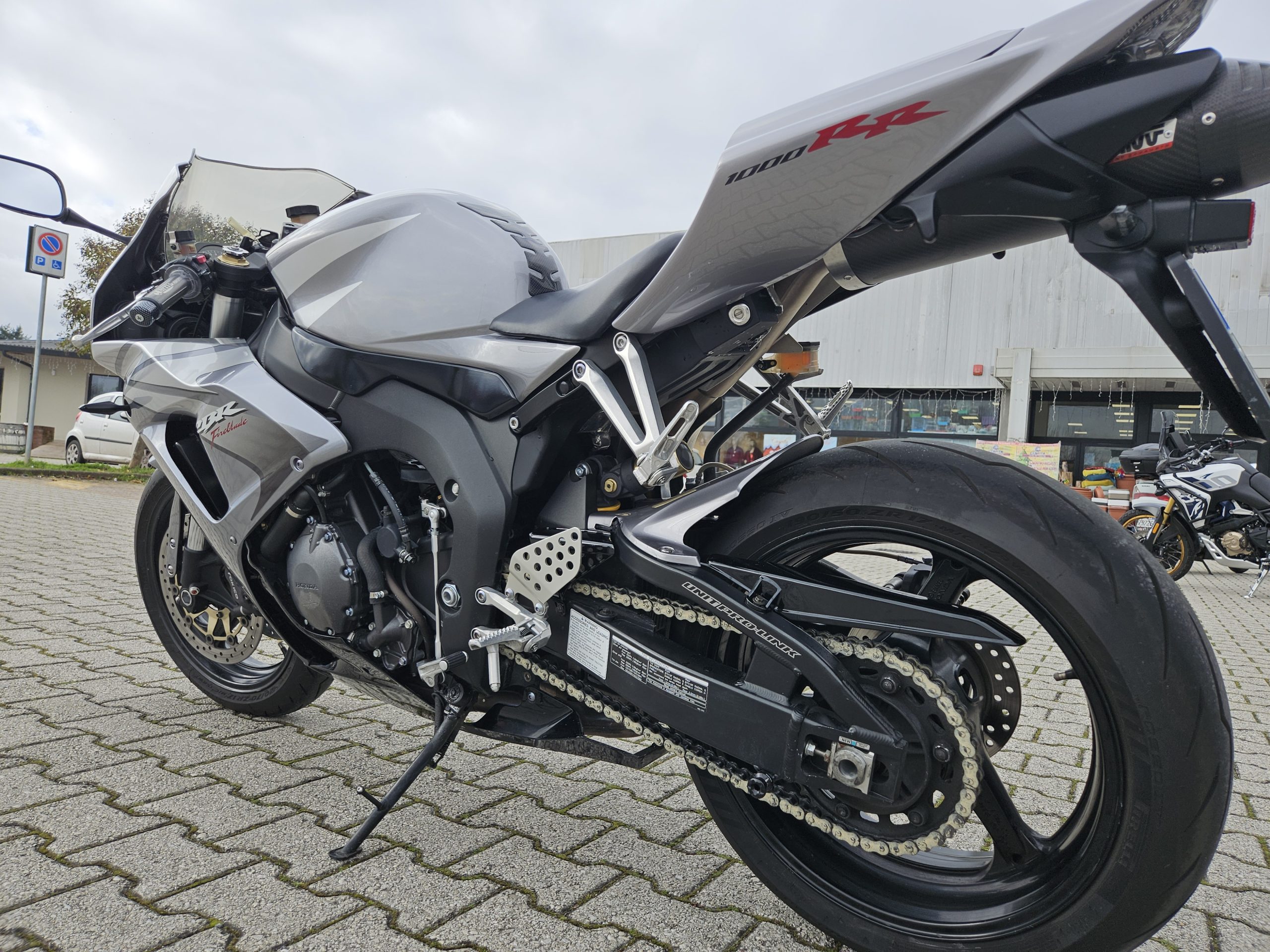 Accessoriata con silenziatore Mivv, frecce sportive, cupolino fumé, rifiniture in carbonio, unghia monoposto originale Honda, parafango posteriore in tinta, paracatena in tinta nero.