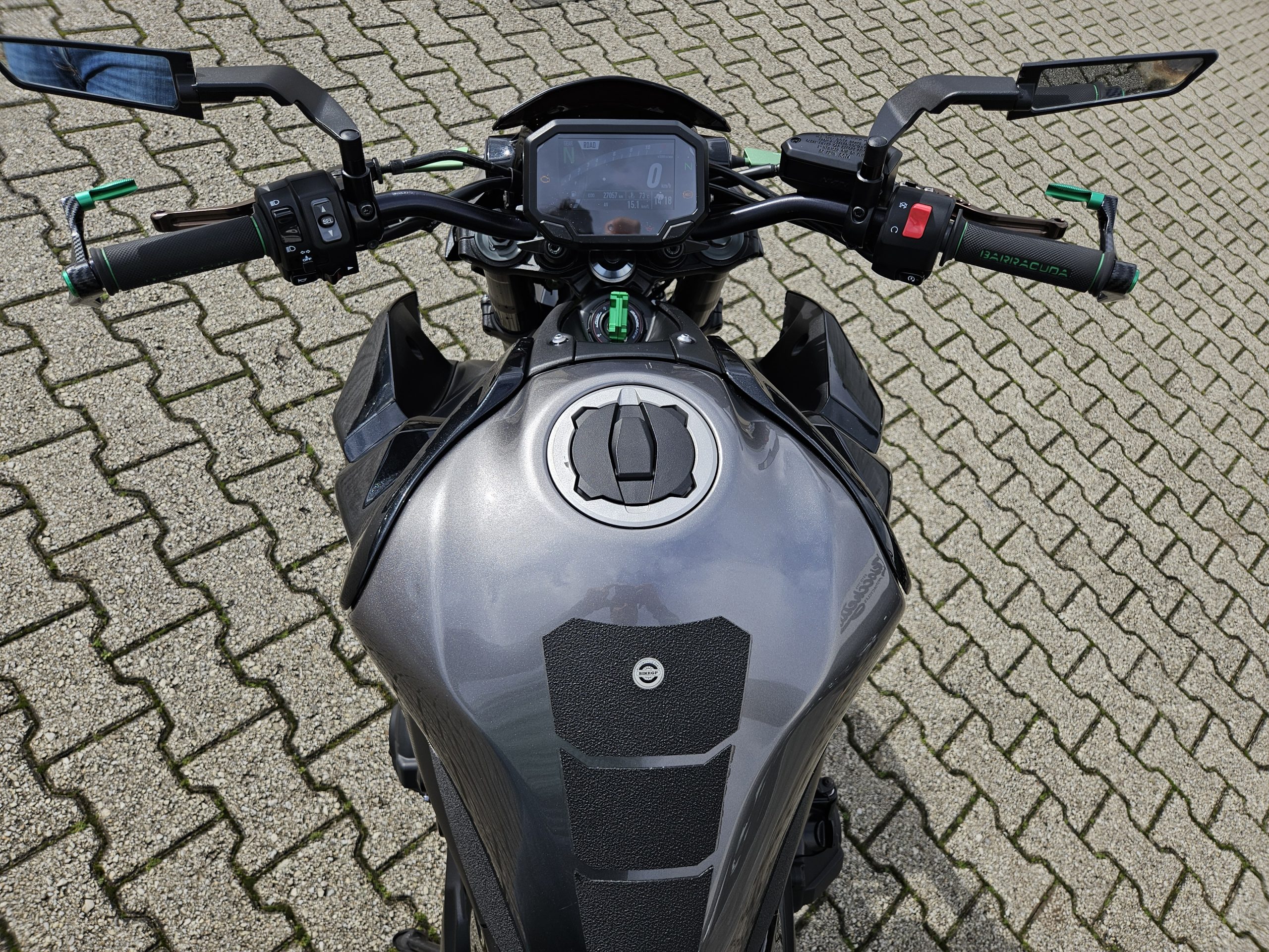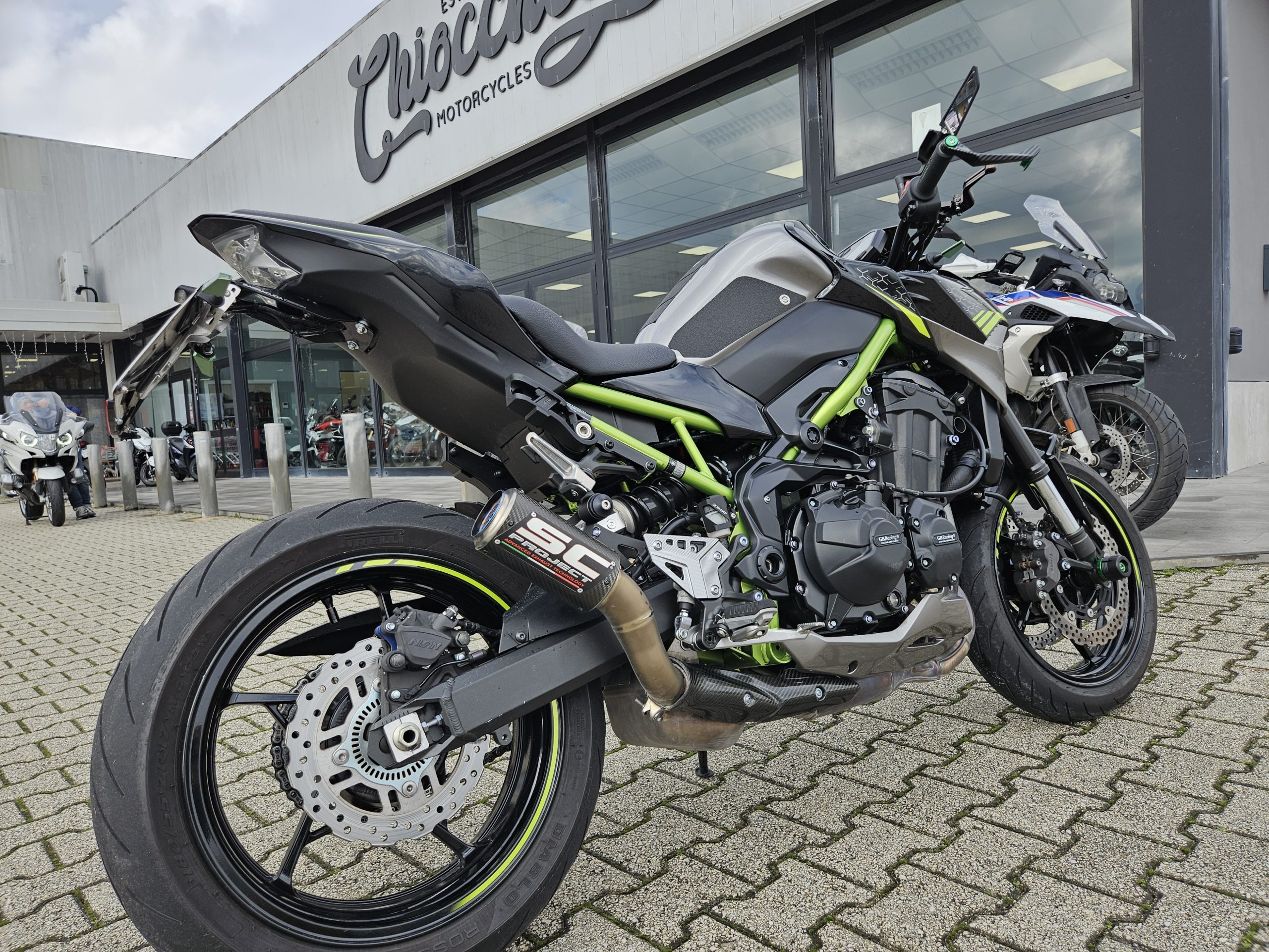 Super accessoriata con specchi sportivi, portatarga Barracuda, frecce sportive anteriori e posteriori, agganci laterali Givi per borse morbide, scarico omologato SC Project più scarico originale.