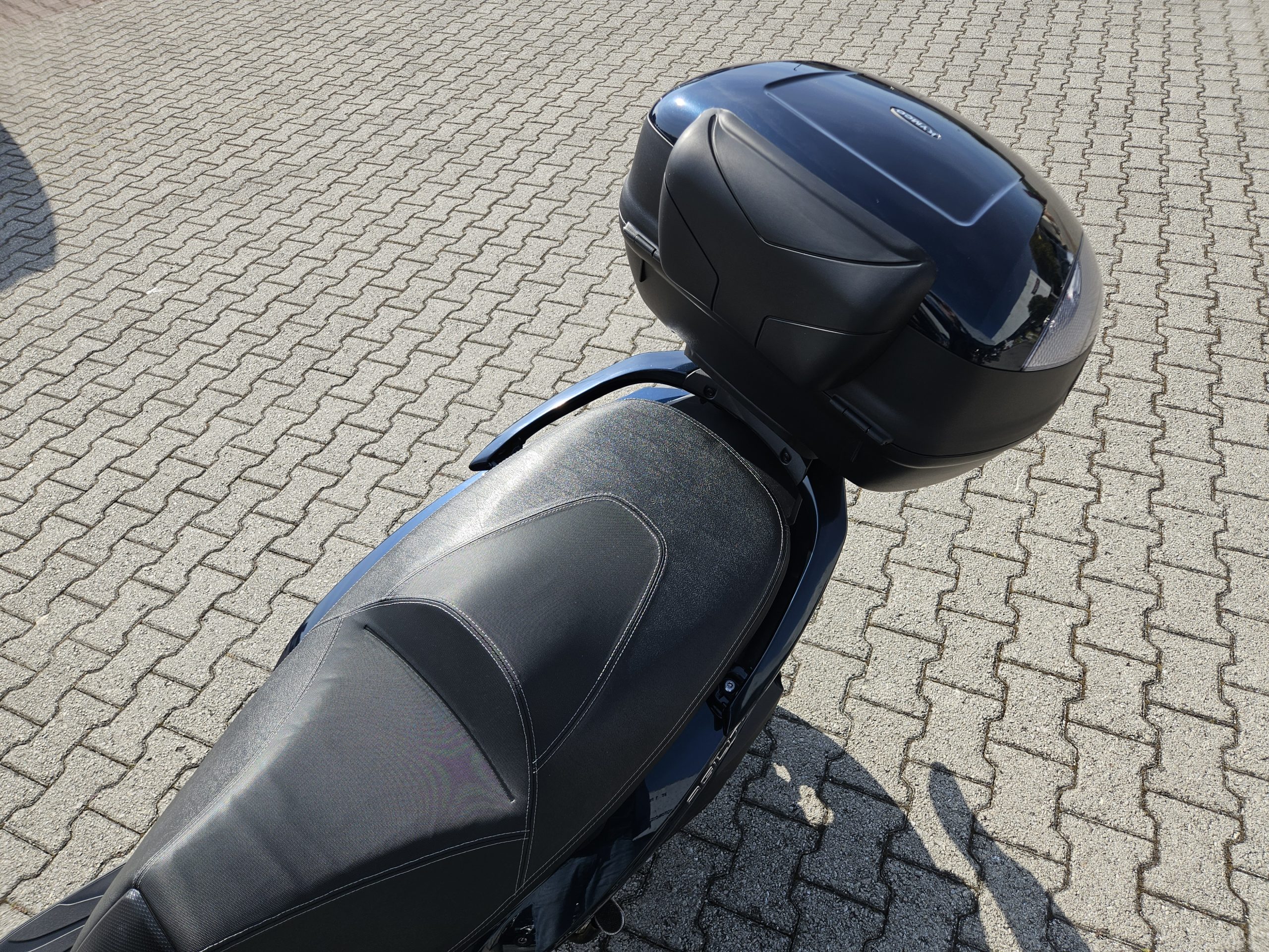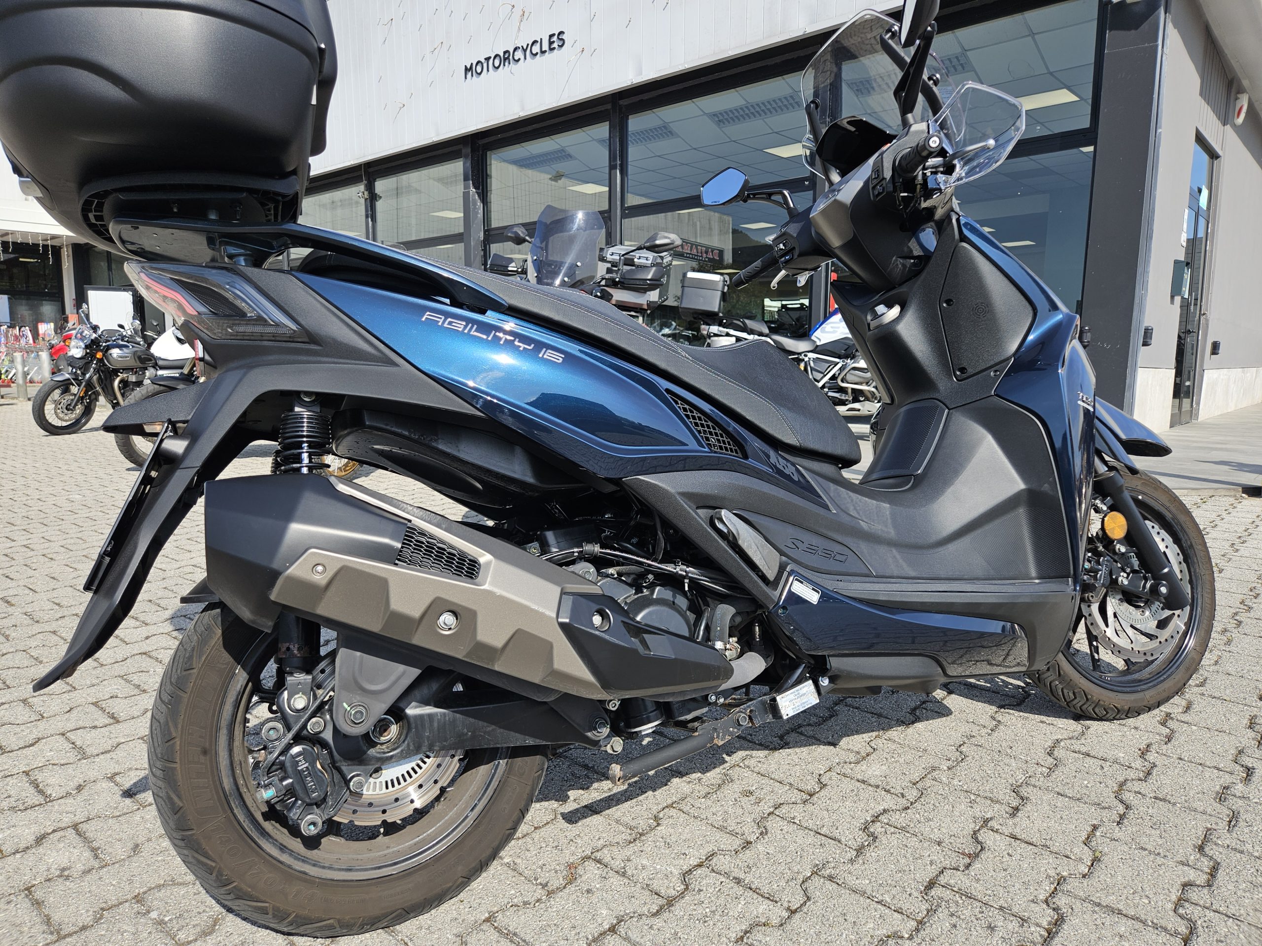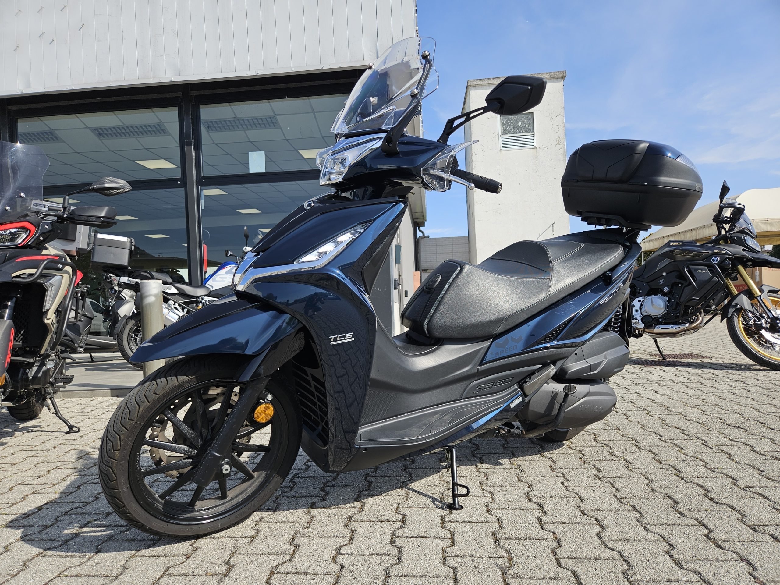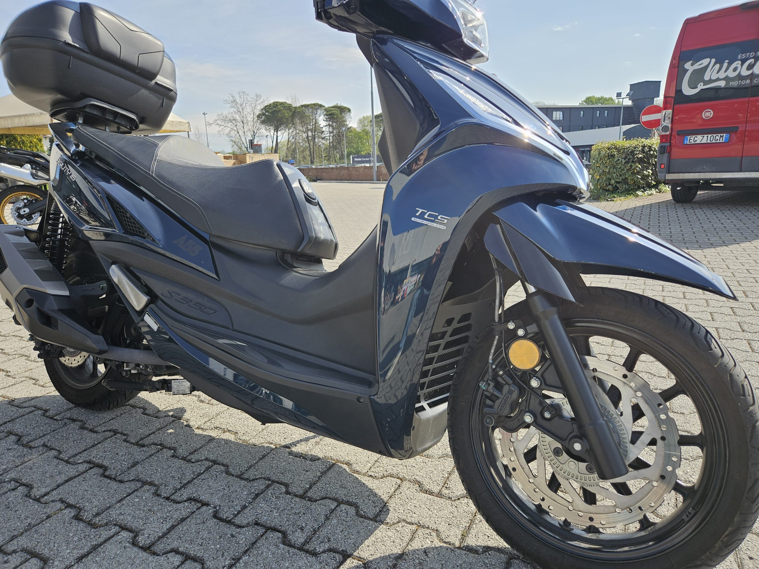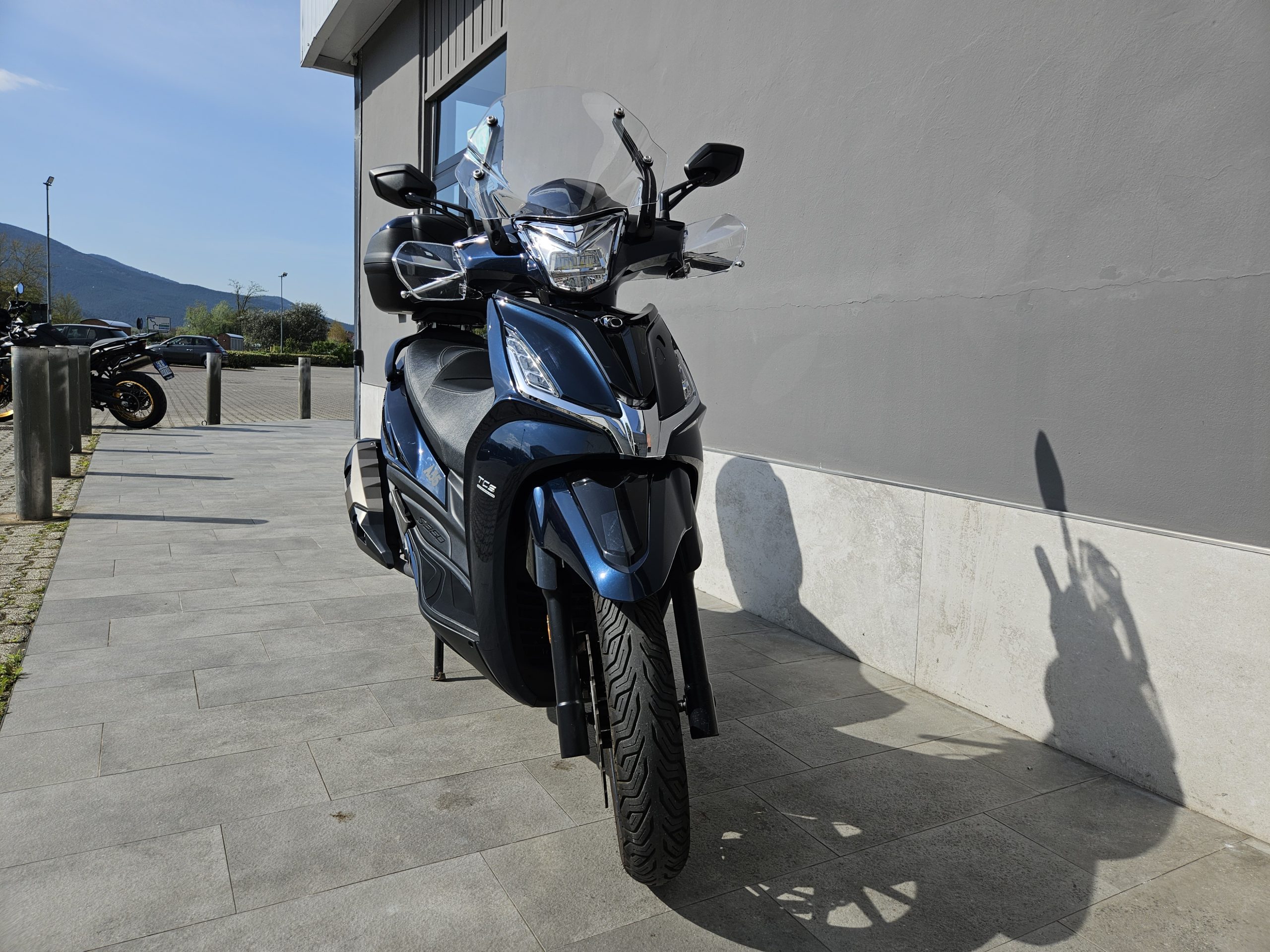 Accessoriato con cupolino, paramani e baule in tinta originale Kymco 47 litri.