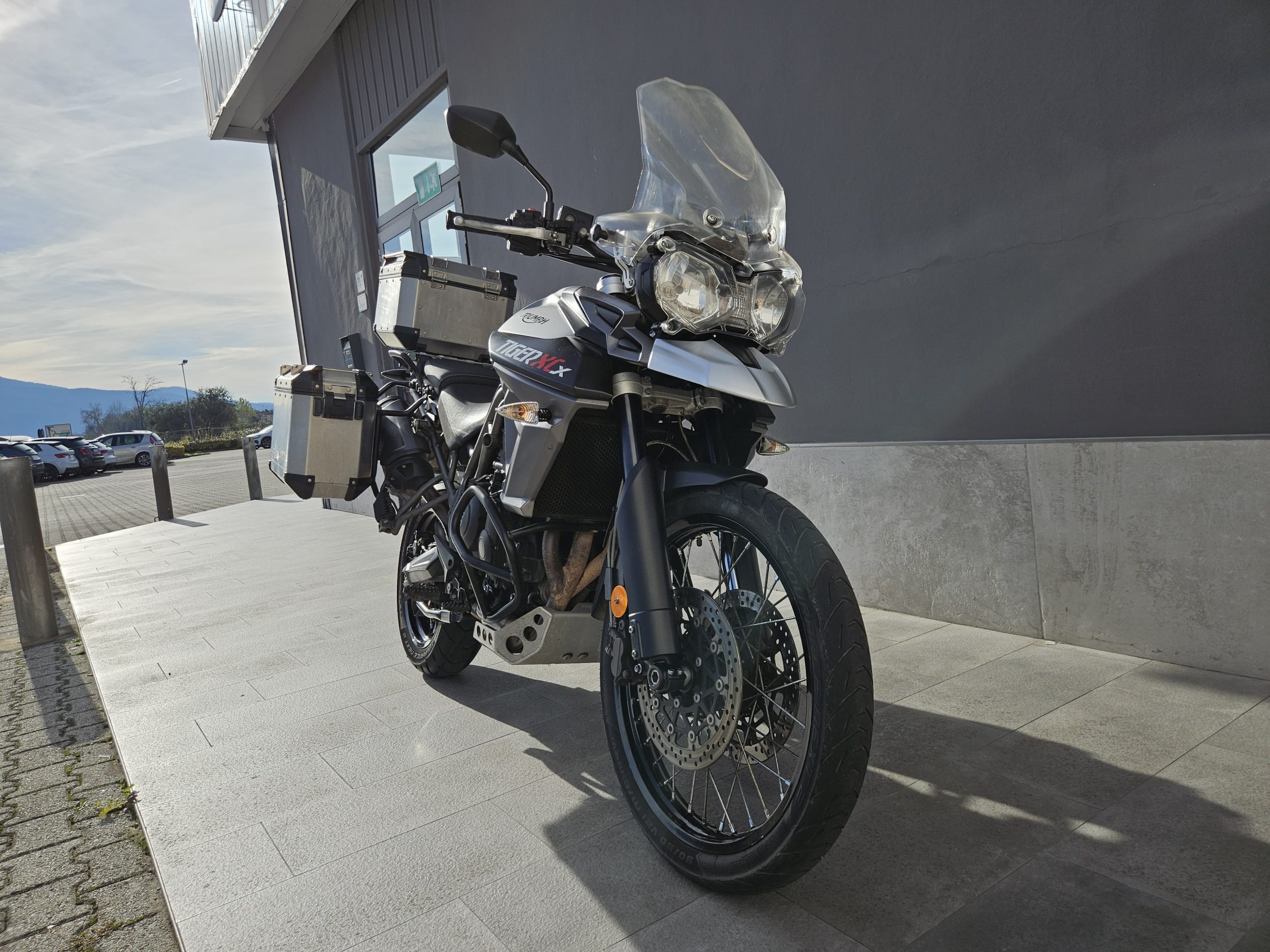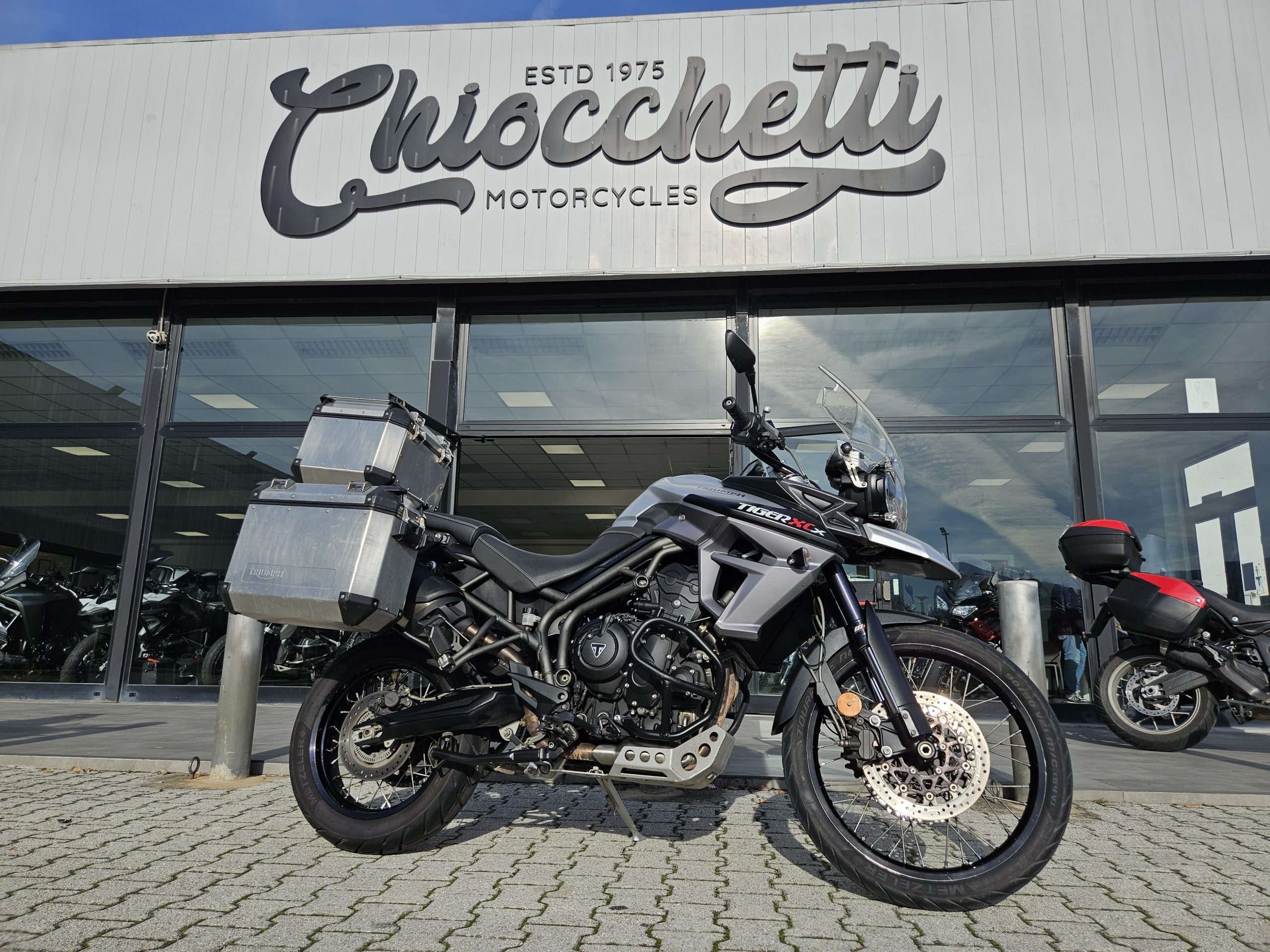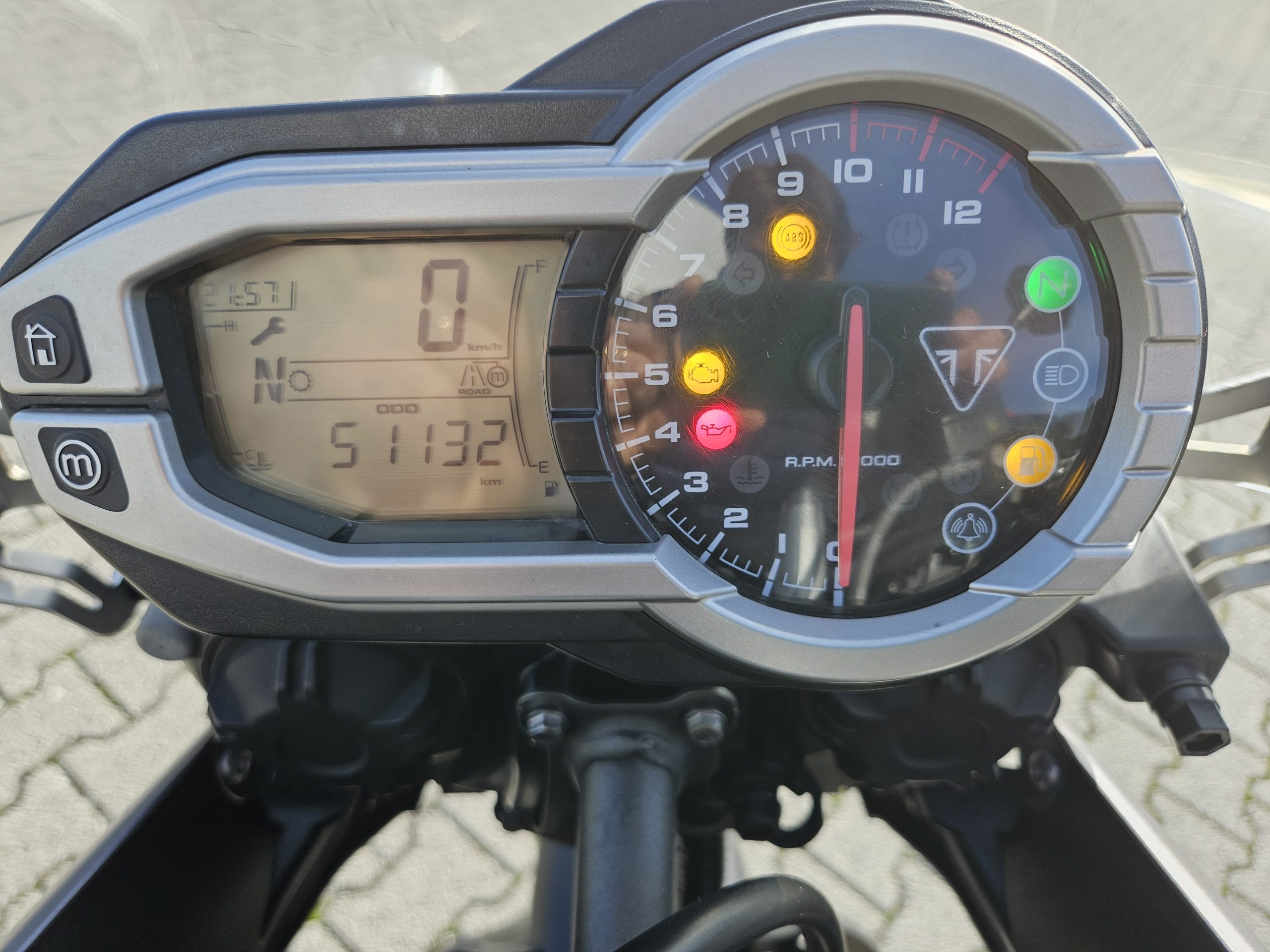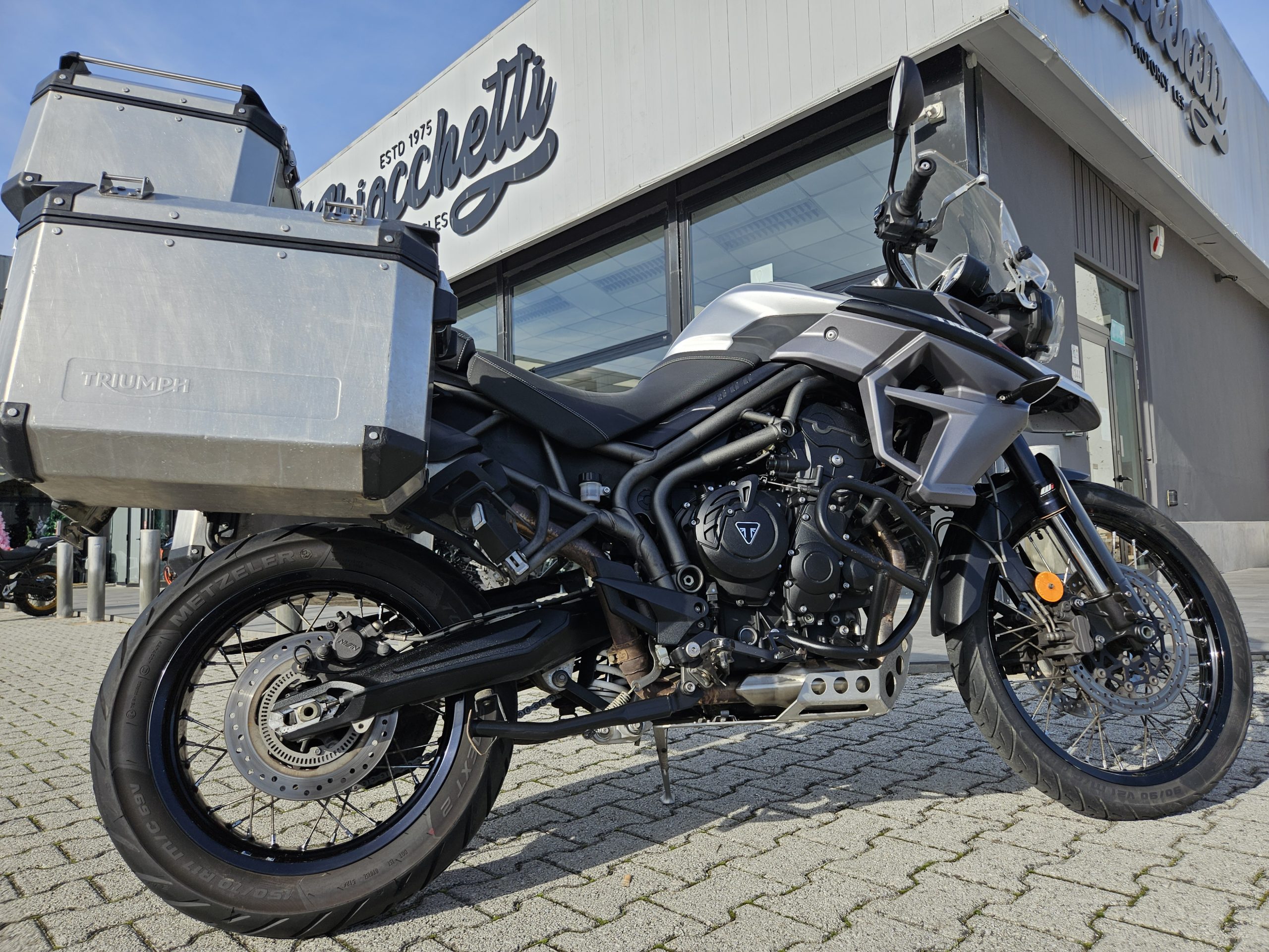 Accessoriata con cupolino maggiorato, paramotori laterali tubolari in alluminio, paracoppa in alluminio, manopole riscaldate, tris di valigie in alluminio originali Triumph.