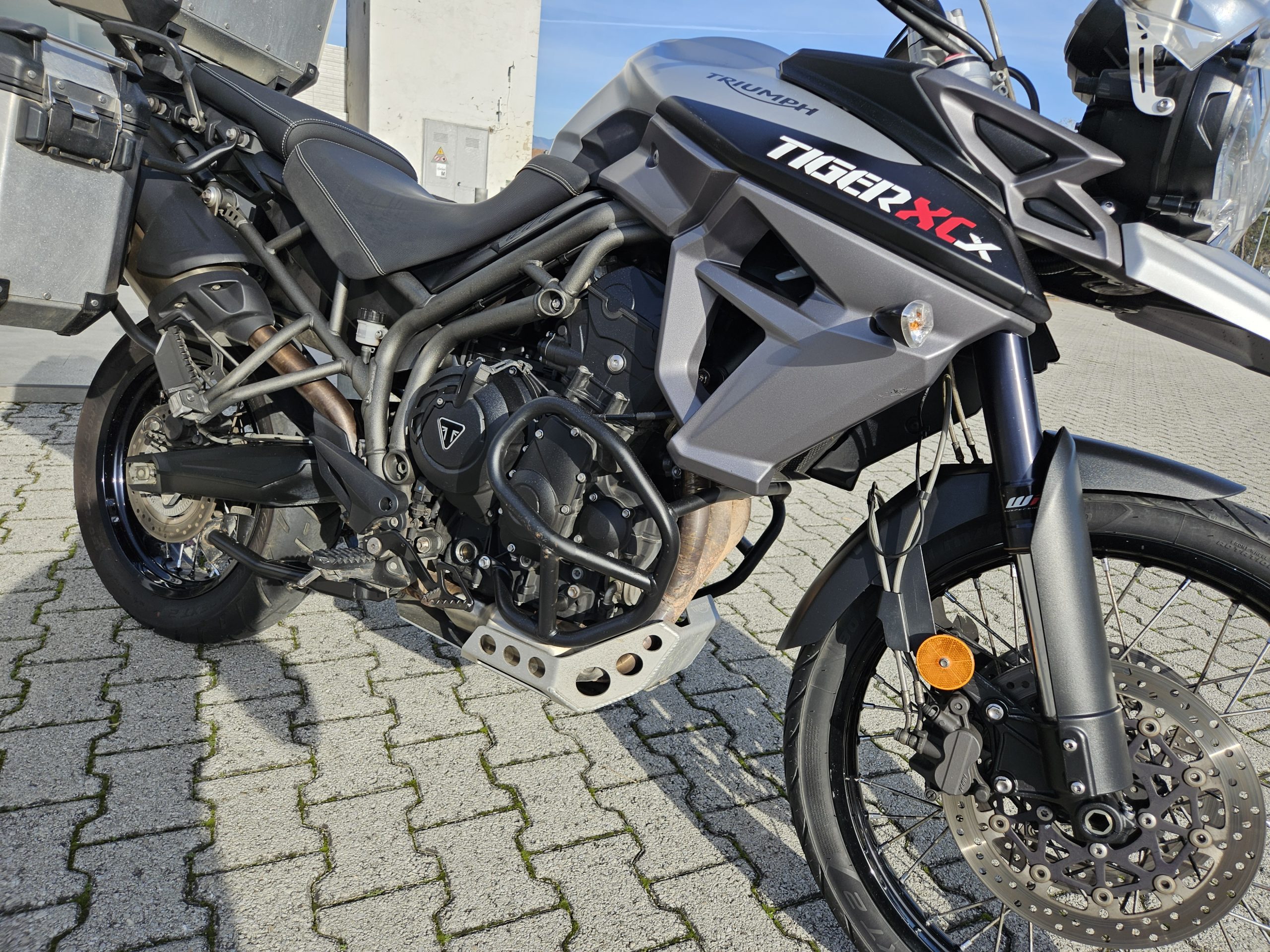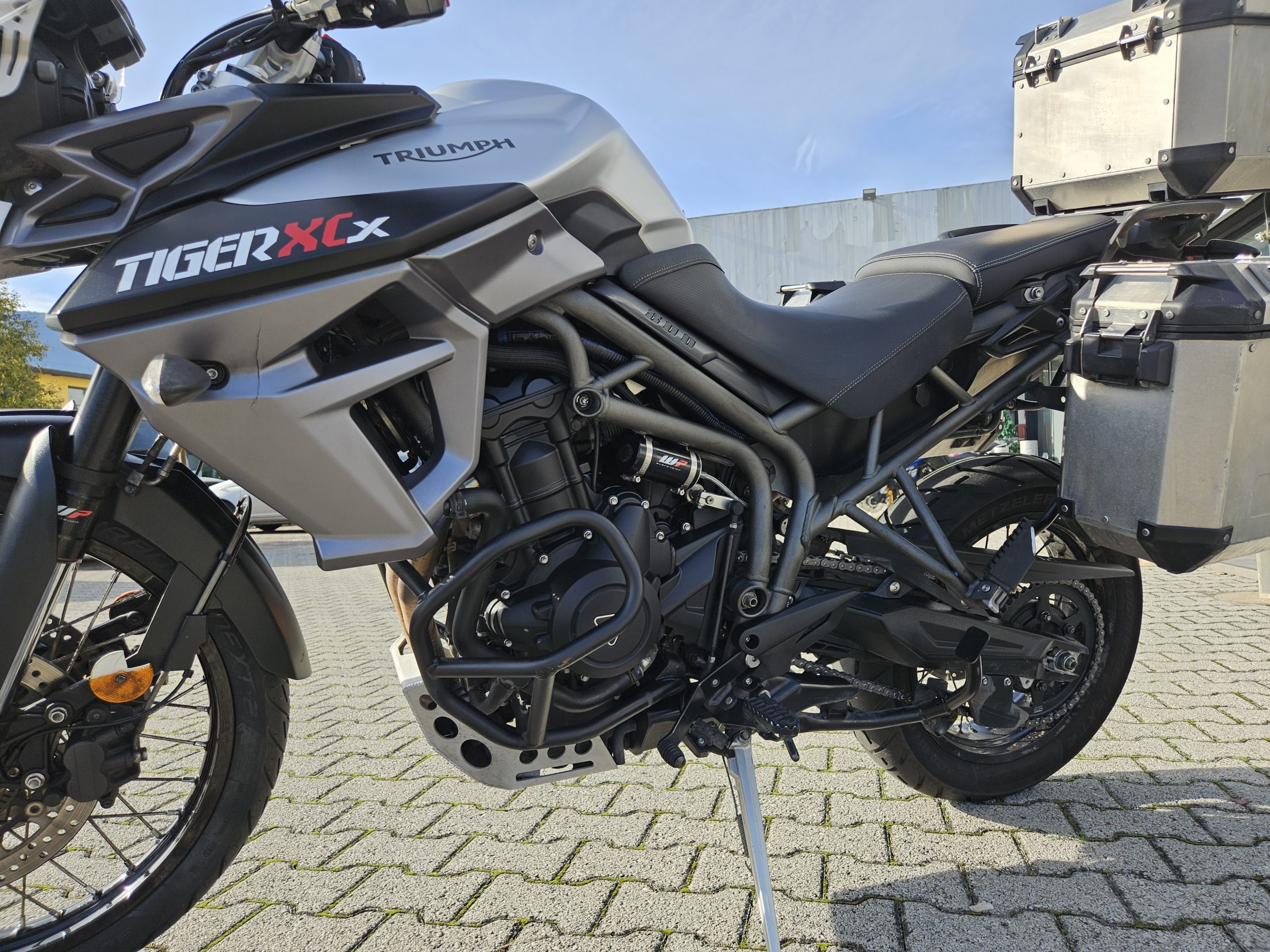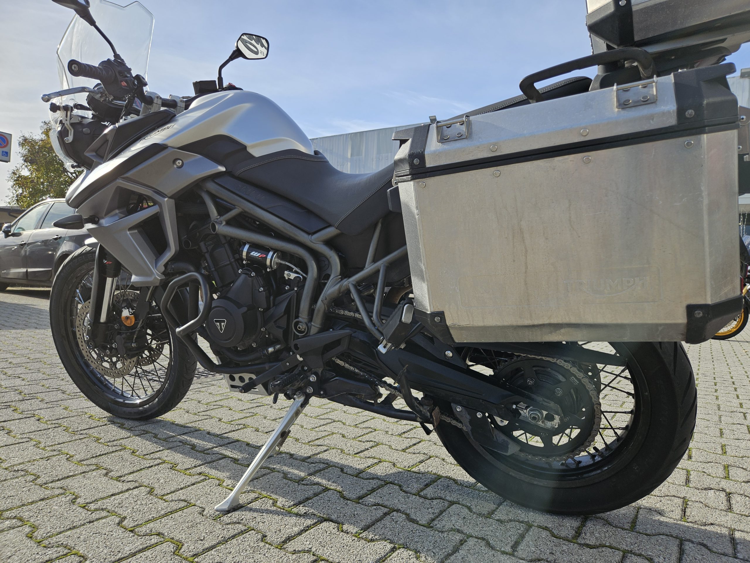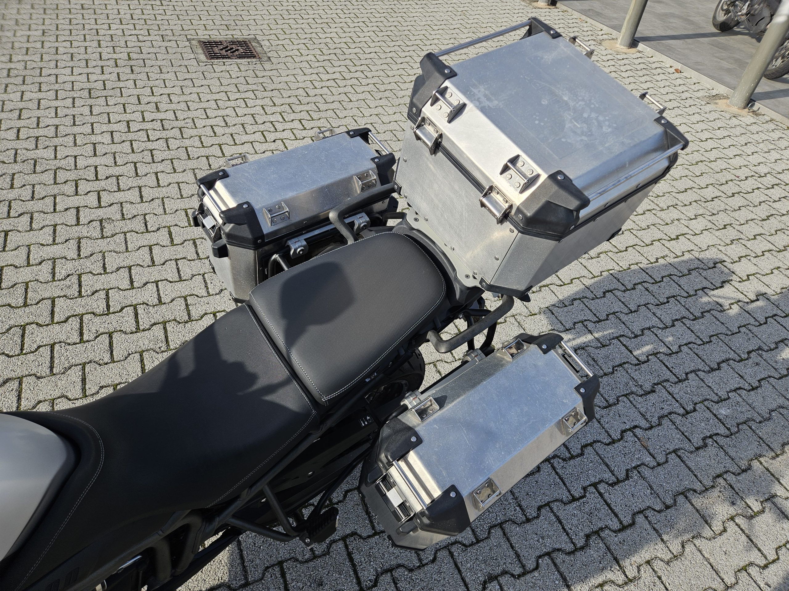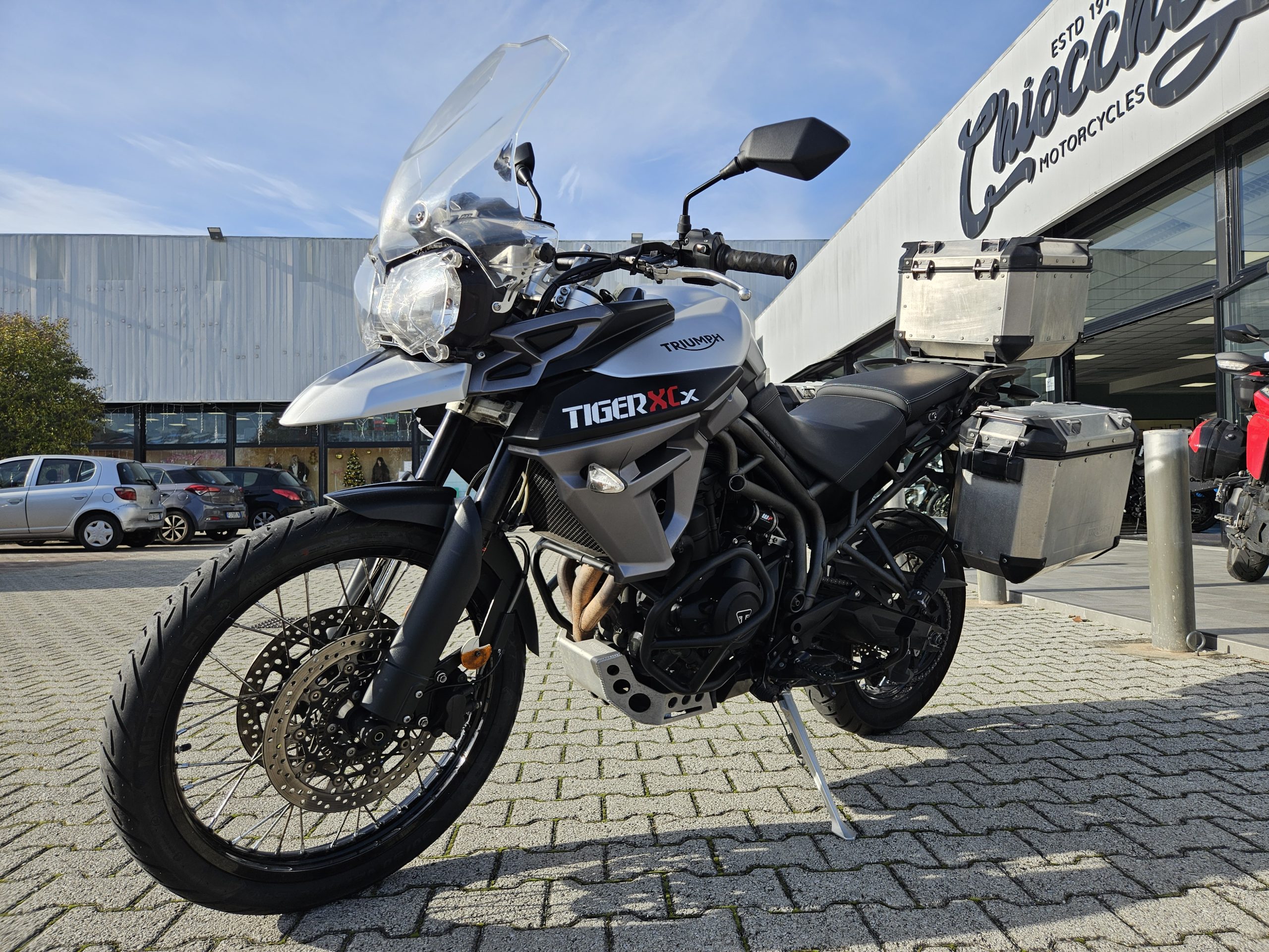 Accessoriata con cupolino maggiorato, paramotori laterali tubolari in alluminio, paracoppa in alluminio, manopole riscaldate, tris di valigie in alluminio originali Triumph.